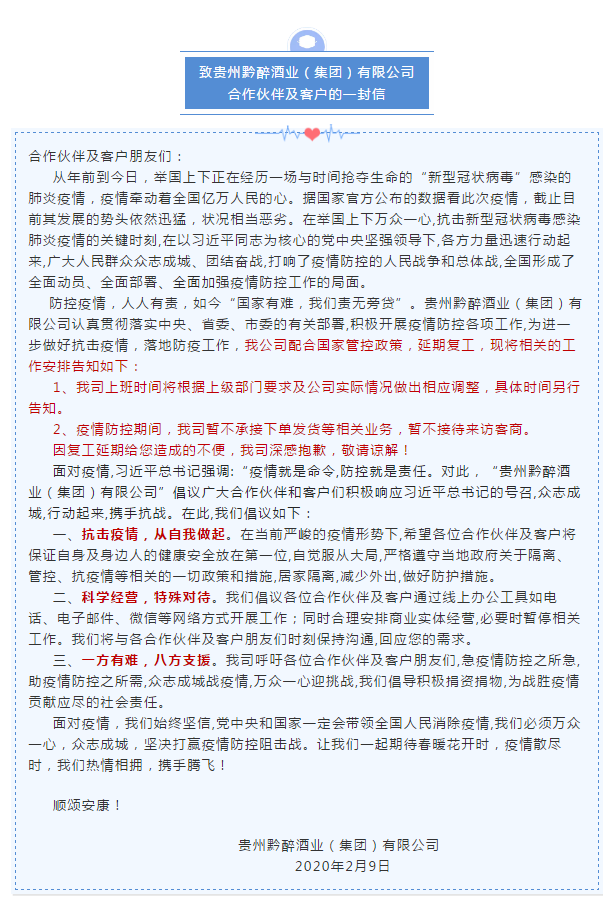 致貴州黔醉酒業(yè)(集團)有限公司合作伙伴及客戶的一封信